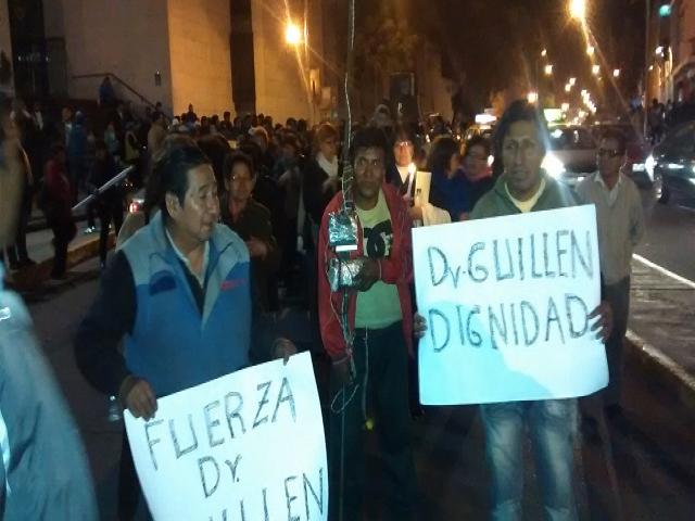 Los manifestantes, que marchan con una vela y carteles donde se leen frases como “fuerza doctor Guillén”, “estamos contigo”, entre otras, se desplazan por las calles San José, Moral, Santa Catalina y Puente Grau.